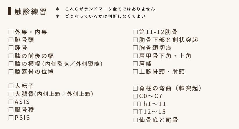 A. この回で触診するランドマーク(下記リスト)が触れる方は、オンライン受講でも大丈夫です!